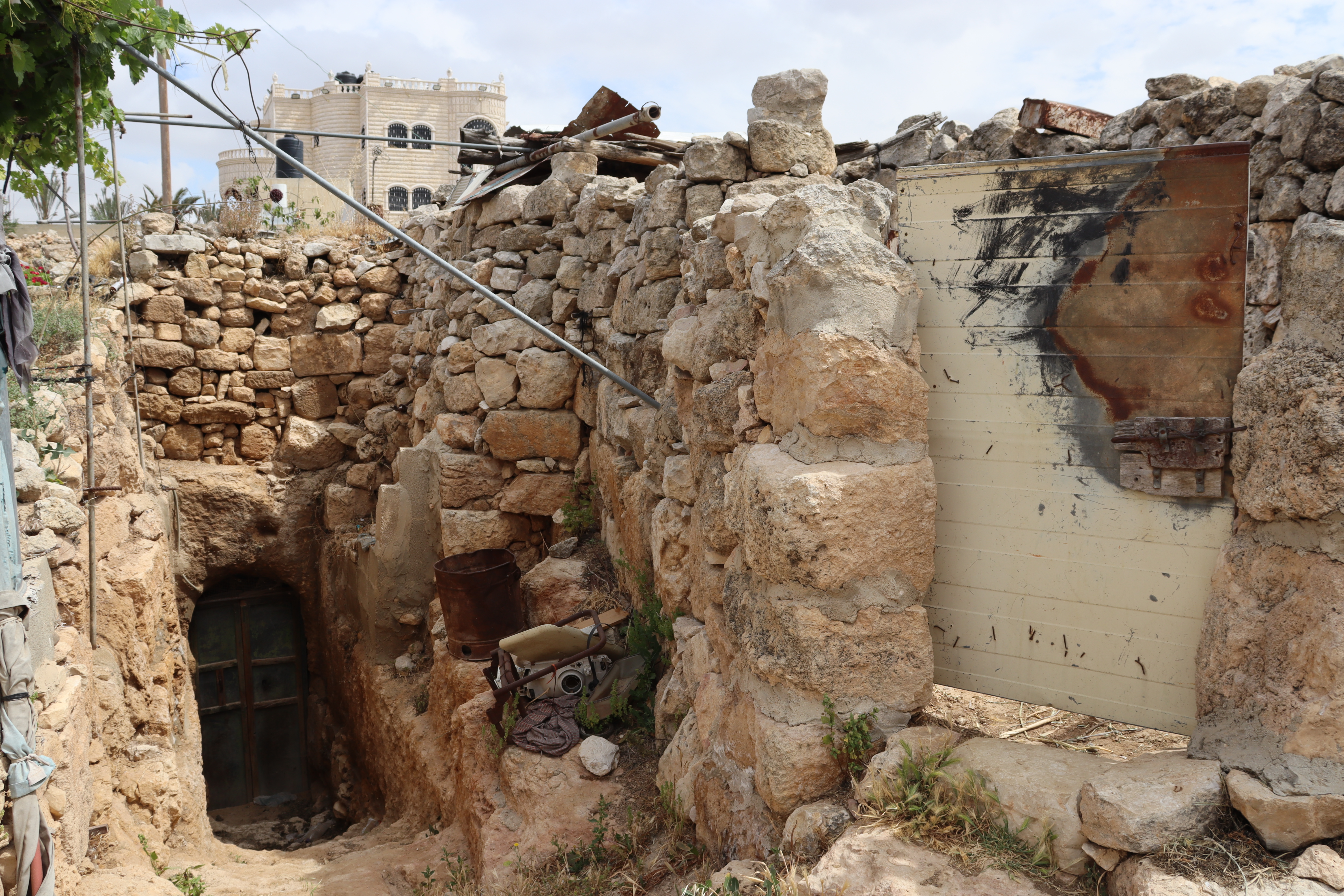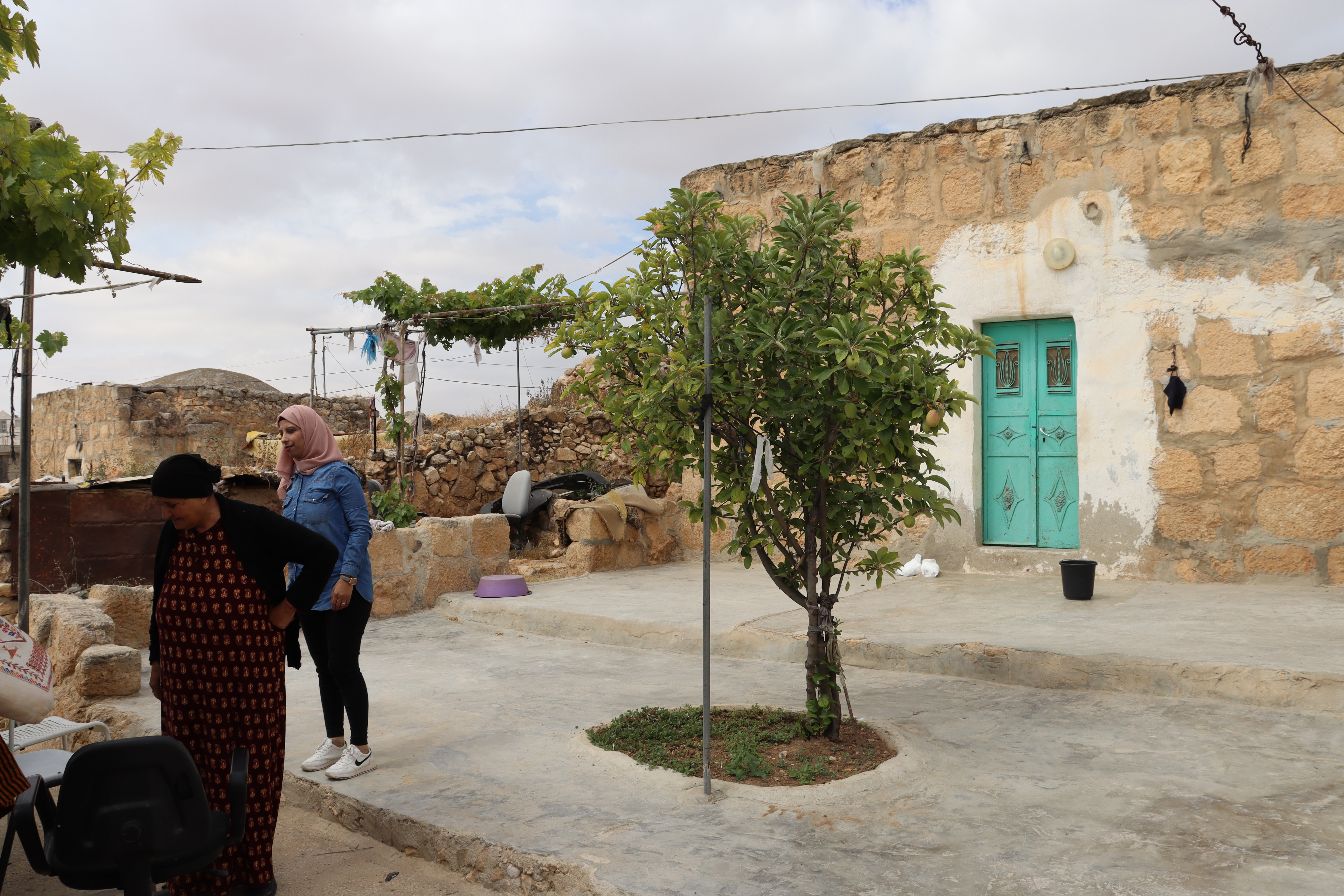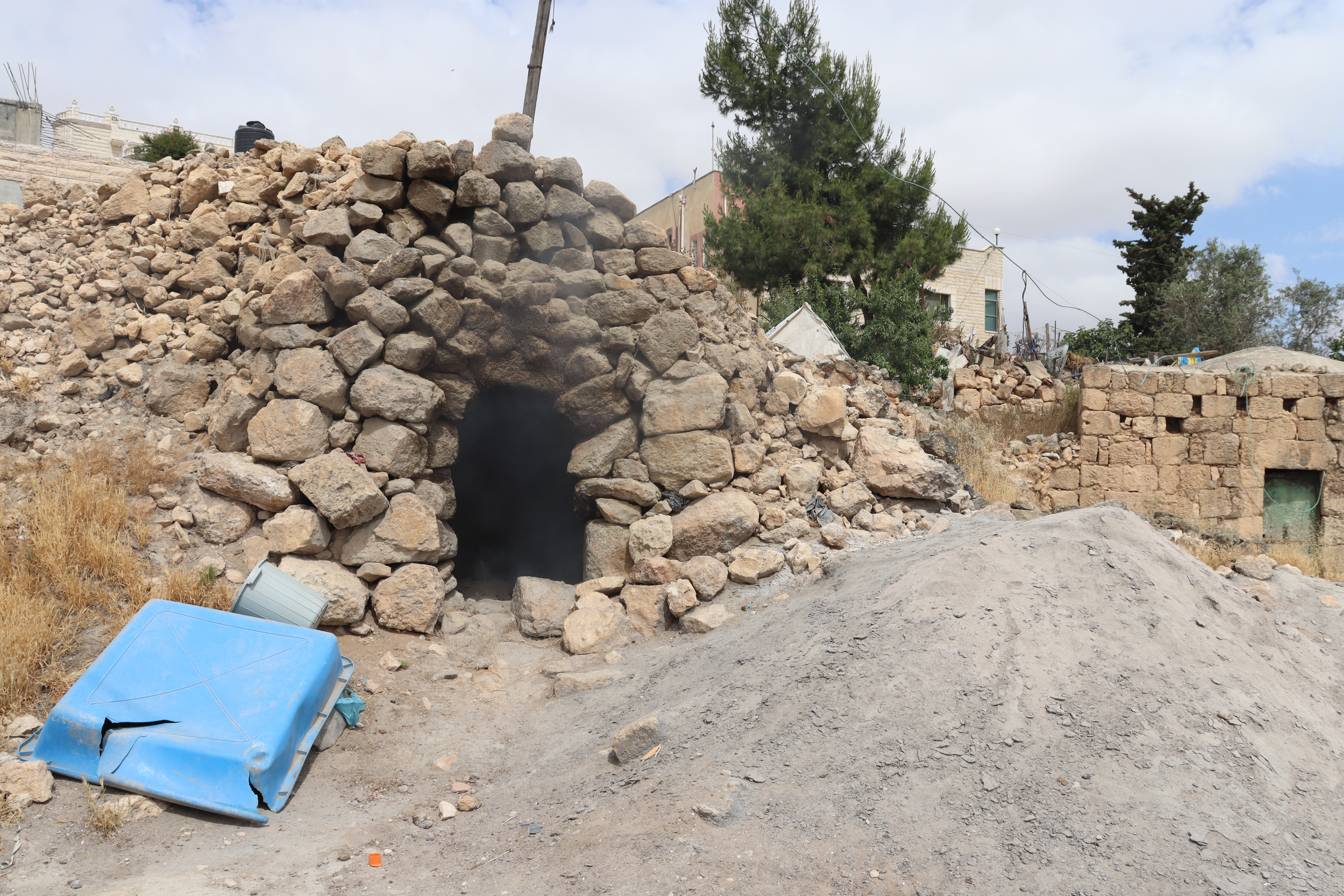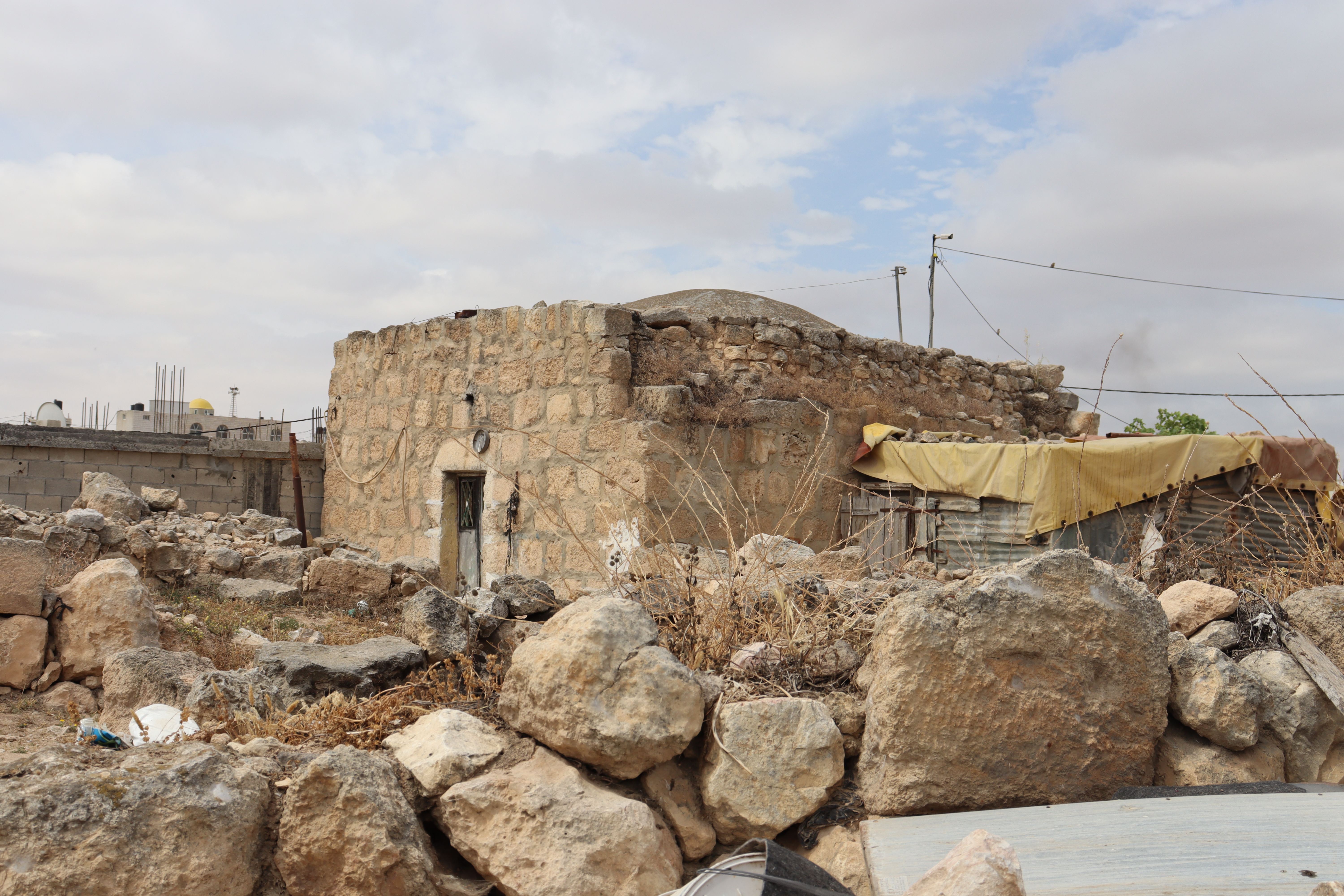 Kh. Al-Karmil: Its location at the end of an arid mountain, at the foot of the desert, makes it the entrance to the Naqab Desert. The traditional buildings represent the peasant way of life of the local community situated between the Roman Pond and the Byzantine Church. The elements of traditional heritage of Al-Karmil town are presented in chronological order, starting with the peasant houses that utilized ancient tombs for living. In later stages, caves were closed off with an outer stone façade, reflecting the architectural style known as “Laqta” in the southern part of Hebron. Then, during the Ottoman era, numerous traditional buildings were constructed. Throughout these periods, Palestinian farmers’ houses were used for cooking and animal husbandry, featuring structures such as Tabun, Saqaef and Tor.