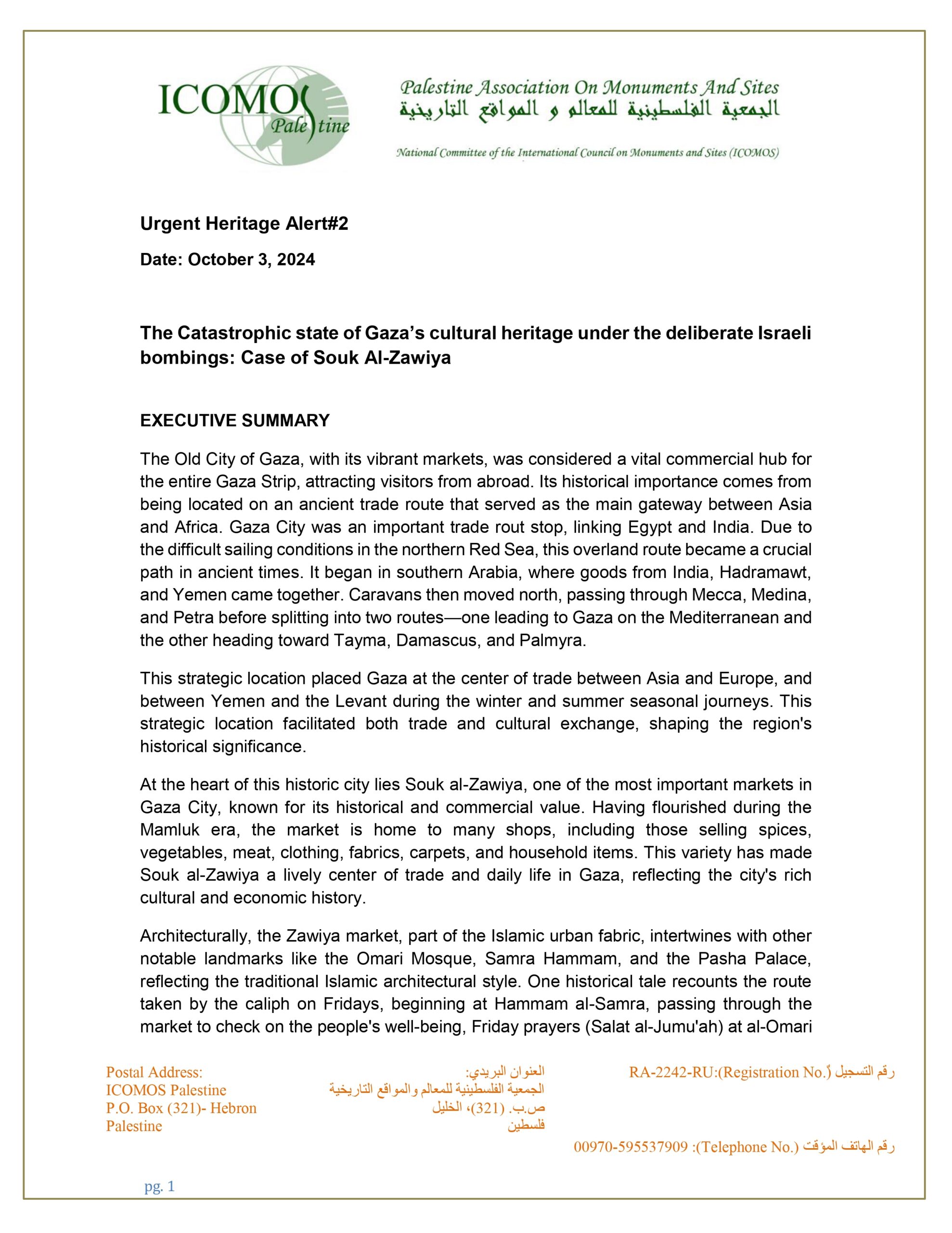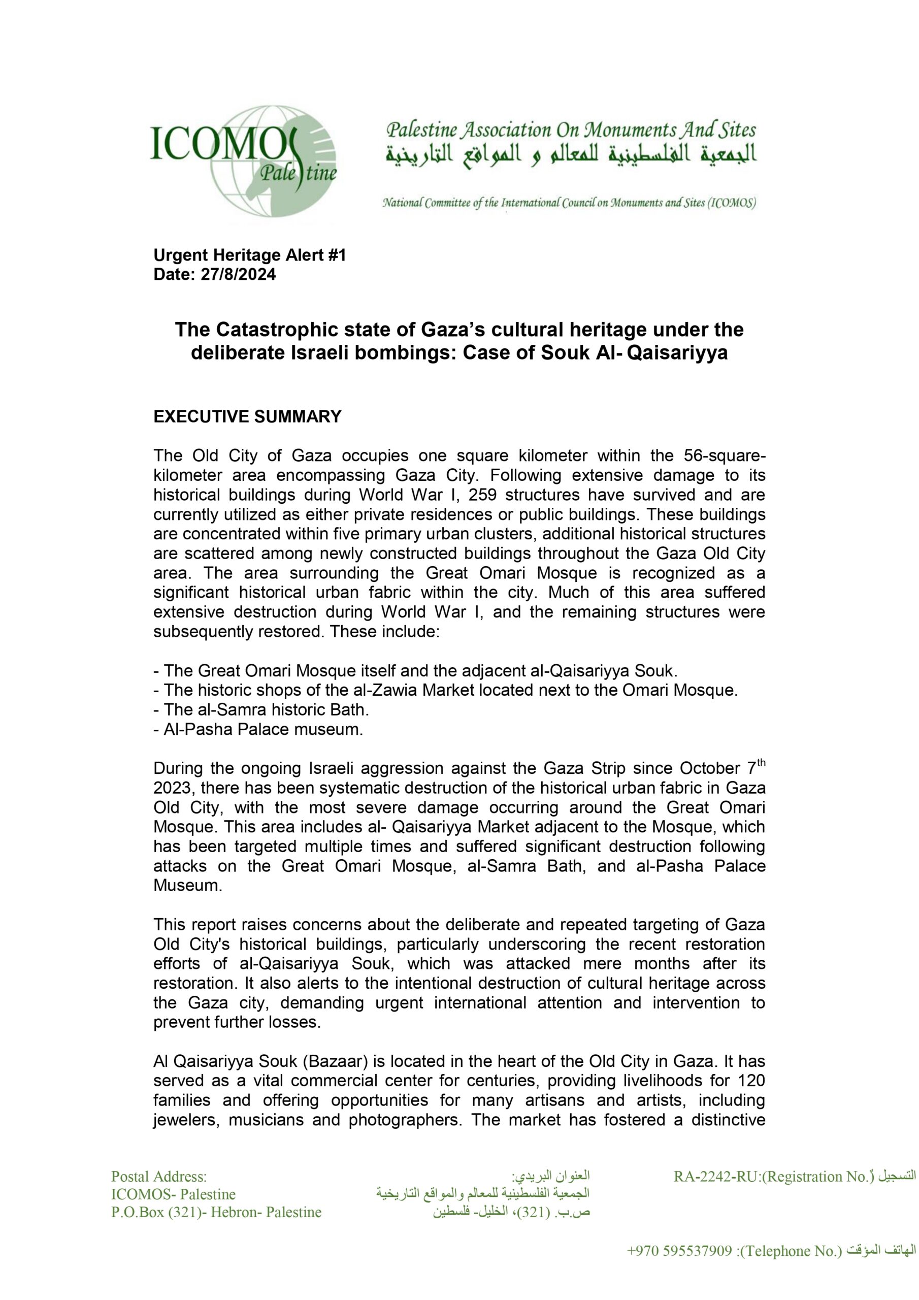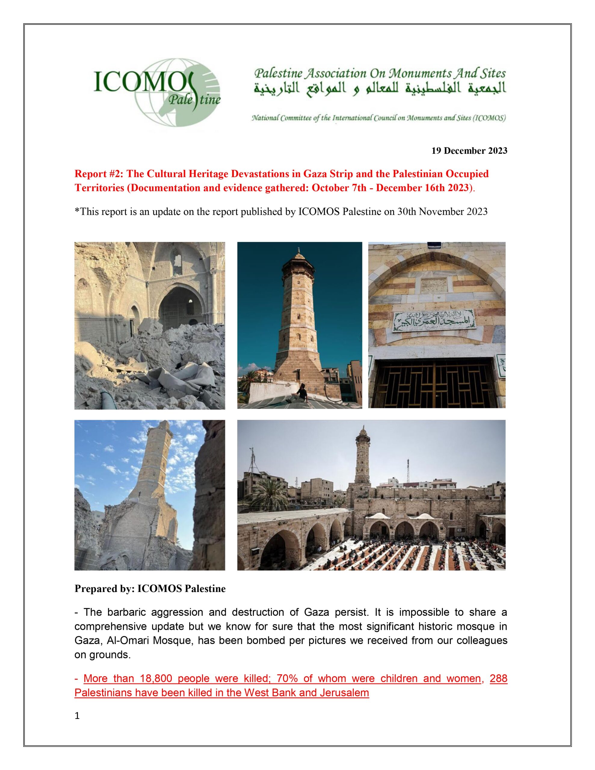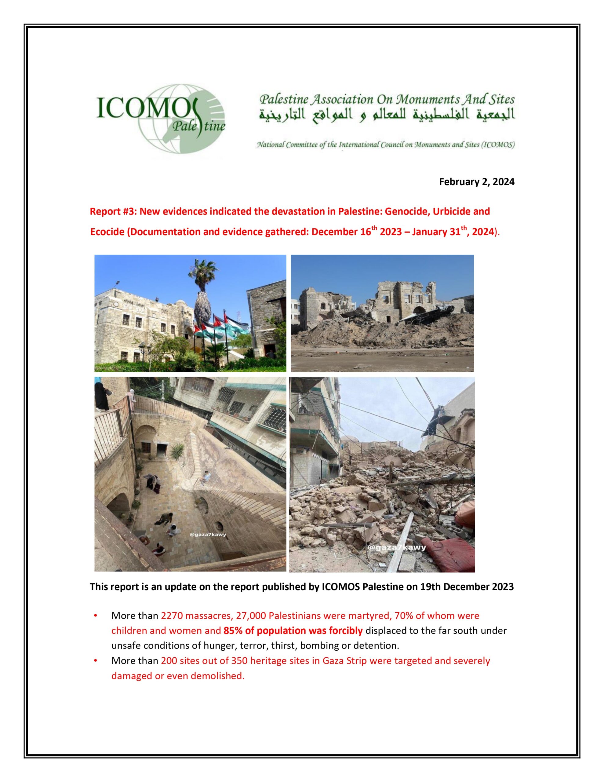 ICOMOS reports aim to document cultural heritage sites, conduct interim assessments, and highlight violations or attacks that contradict UNESCO’s recommendations for the preservation and management of cultural heritage sites in the state of Palestine. These reports function to inform the public about ongoing developments, raise awareness, evaluate, and shed light on issues, including heritage alerts